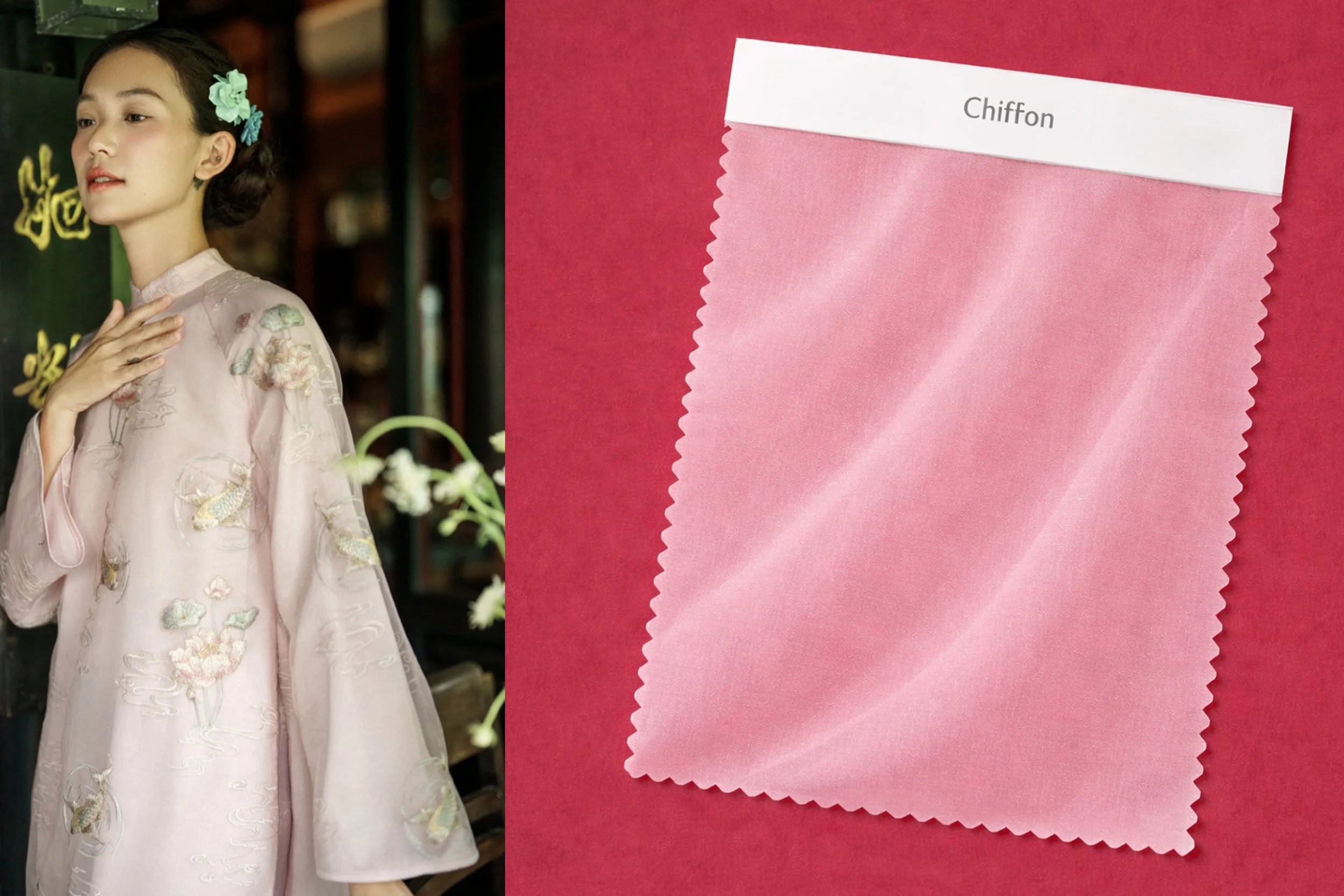 Chiffon is a sheer, airy fabric that creates a soft and dreamy look. It works beautifully for modern áo dài designs, especially when layered over lining fabrics.