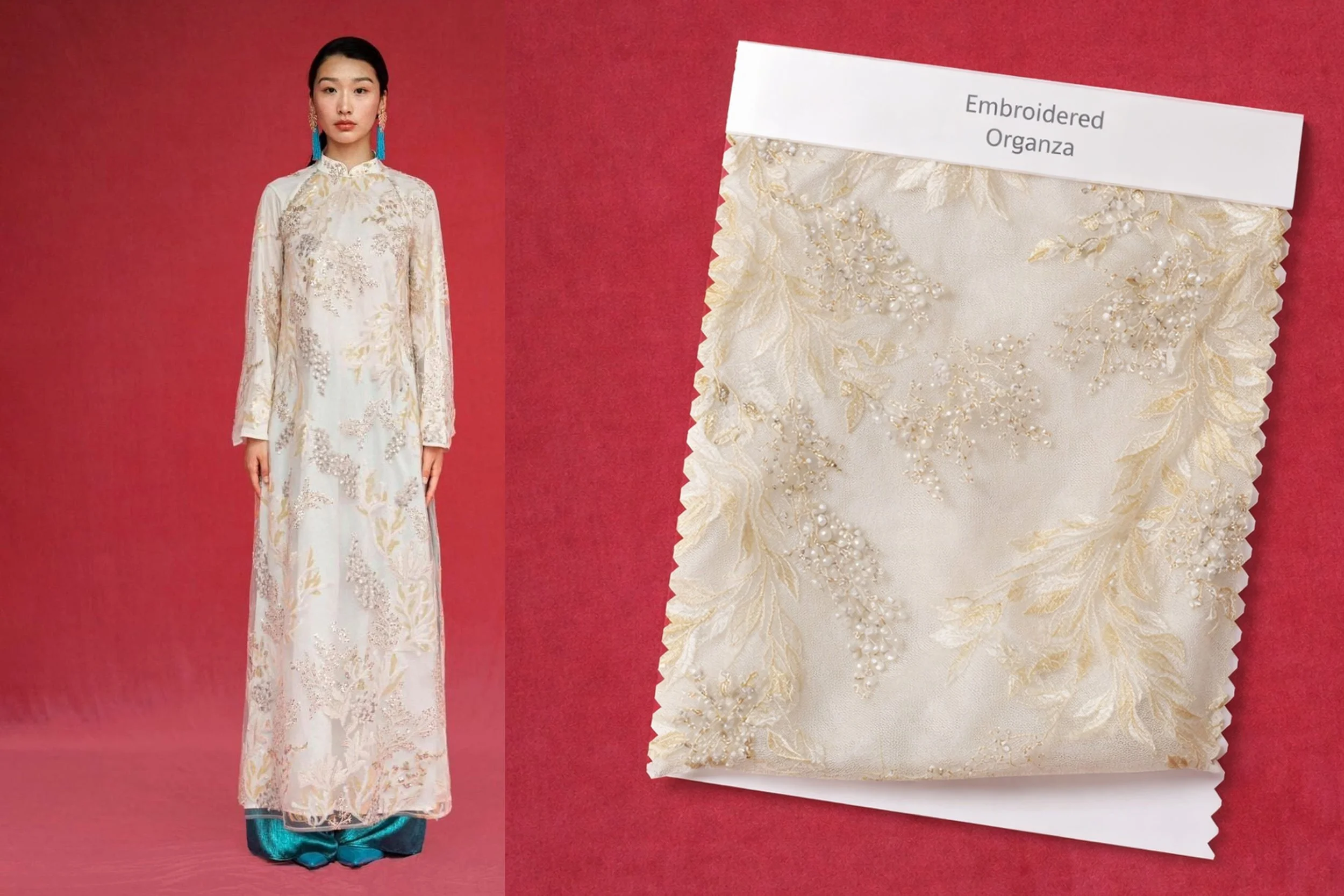 Because organza holds its shape well, embroidered versions create a beautiful balance between structure and delicacy, making the áo dài feel both refined and dramatic.
